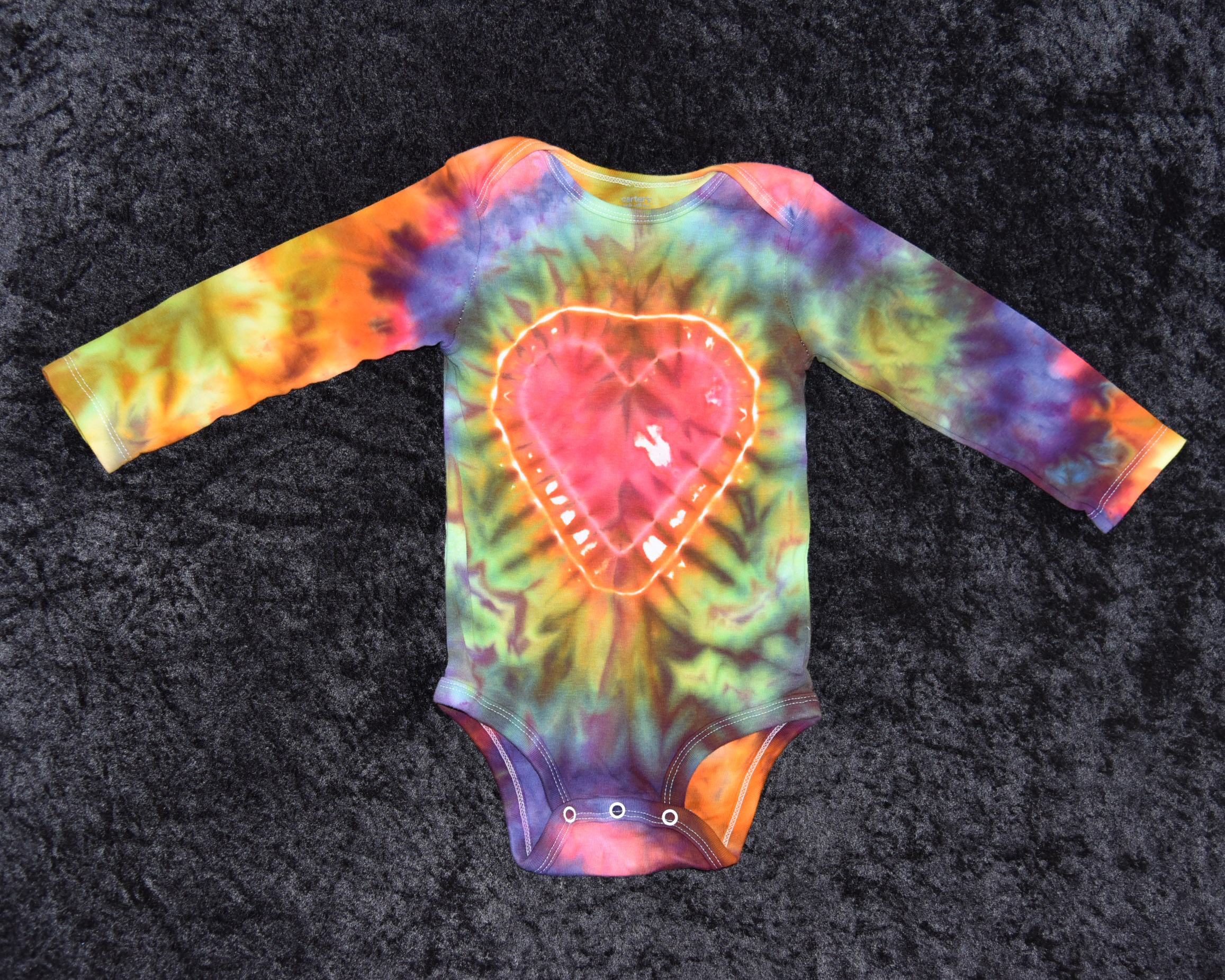 After the dye process my items are thoroughly rinsed by hand and are then put through at least two full HOT wash cycles to remove excess dye. Please keep in mind that although my items have been thoroughly laundered you will still need to wash with LIKE colors. Upon receiving your new tie dye, be sure to launder the item before wearing, especially those meant for babies, with your usual detergent except those noted below. I have not used fabric softeners or dryer sheets after laundering, however, the professional textile detergent that I use leaves a slight floral scent.